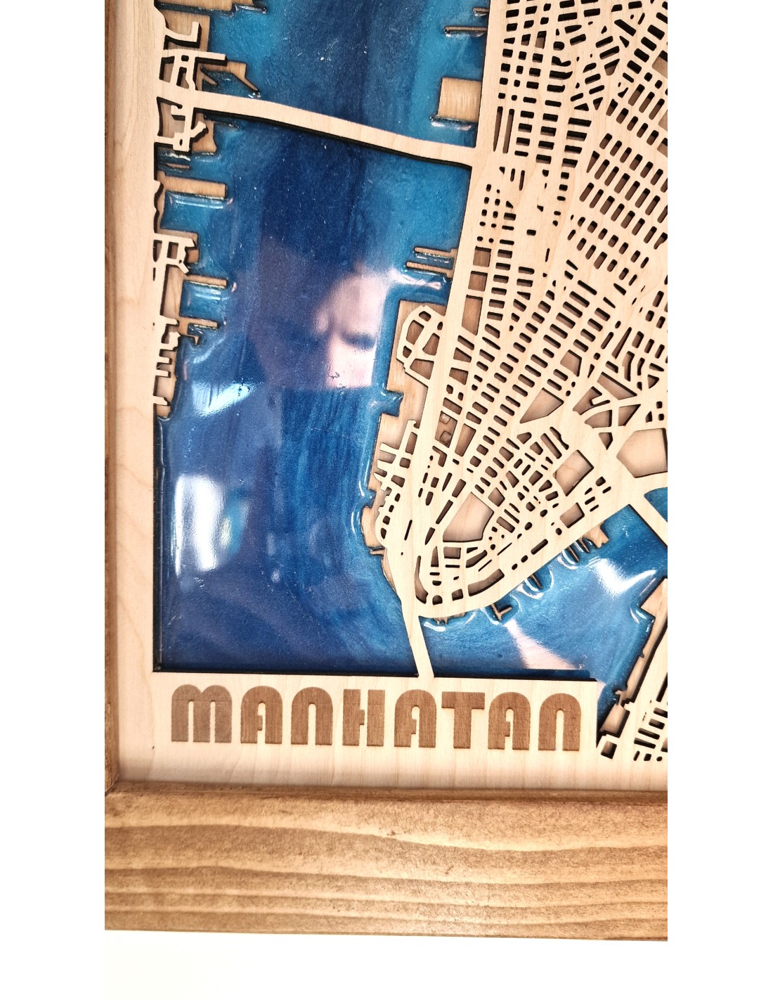 Handgefertigte 3D-Stadtkarte aus Holz mit Epoxidharz und rustikalem Rahmen – komplett personalisierbar.
